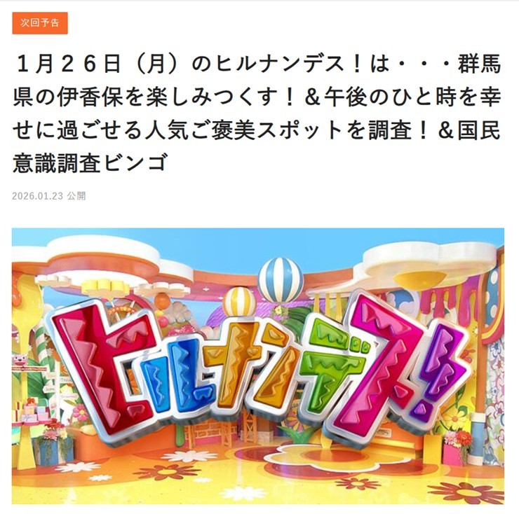 「ヒルナンデス!」で紹介されました。 2026.1.26 最終更新日時 : 2026.1.26 ikaho-166-house-2024 日本テレビの「ヒルナンデス!」で、「IKAHO HOUSE 166」が紹介されました。出演者が「卯三郎こけし 石段店」で、創作こけしの絵付け体験を楽しむ様子などが放送されました。